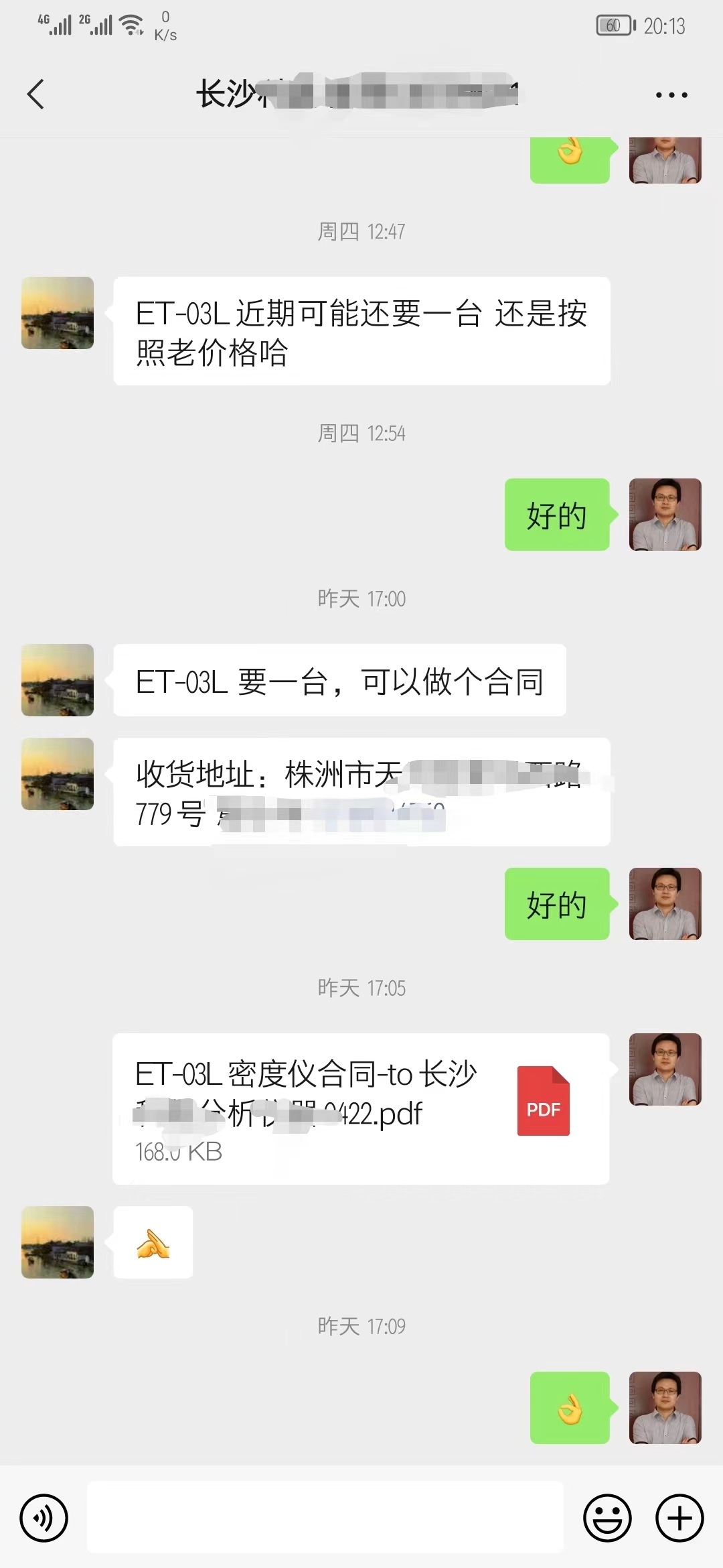 這位長沙的老客戶,前不久出了一臺液體密度計ET-03L的,有了合作的基礎(chǔ),再次來訂購更是簡單直接了!感謝客戶關(guān)照!