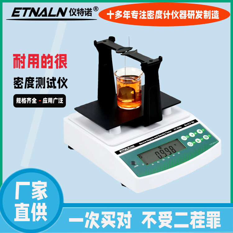 鹽水濃度與密度測(cè)定儀_鹽水電子密度計(jì)ET-01SC、ET-02SC是北京儀特諾公司根據(jù)阿基米德原理,采用德國進(jìn)口高精度測(cè)量傳感器,依據(jù)GB/T1266-2006、GB 1253-2007標(biāo)準(zhǔn)規(guī)范,先測(cè)得密度值,然后由密度值自動(dòng)計(jì)算出鹽水濃度值%、波美度Be;測(cè)量精準(zhǔn)、簡(jiǎn)便快速、可靠性高等特點(diǎn)。